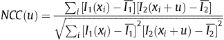 $\overline{I_1}$ 和 $\overline{I_2}$ 是窗口的平均值图像。$I_1(x,y)$和$I_2(x,y)$分别是两张图片。$N$是“窗口”大小,$x_i=(x_i,y_i)$ 是窗口的像素坐标,$u=(u,v)$ 是通过NCC系数计算出的位移或偏移。NCC系数的范围为[-1,1]。 NCC峰值相对应的位移参数表示两个图像之间的几何变换。此方法的优点是计算简单,但是速度特别慢。此外,此类算法要求源图像之间必须有显著的重叠。
