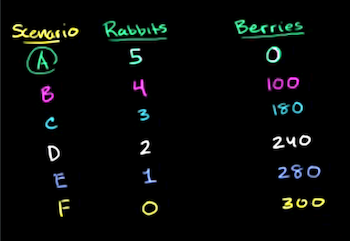 一个靠打猎和采集植物为生的人,在考虑一天应该分别花多少时间来打猎和采集。我们把问题简化为对打兔子(Rabbits)和采浆果(Berries)之间的取舍。
