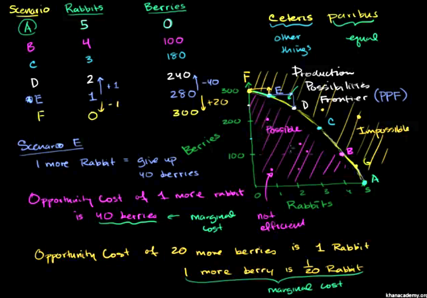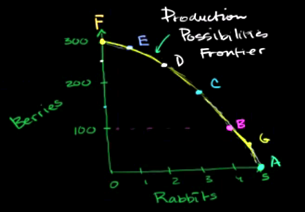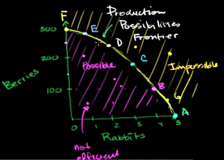 生产可能性边界表示了可以同时得到兔子和浆果的组合。我们得不到(Impossible)在边界外侧的组合(比如我们无法一天同时获得5只兔子和200个浆果);曲线内侧的点都是可以实现的(possible),不过并不是最优的。