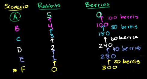 我们回到之前的表格(如上图),当我们在F位置时,有300个浆果,0只兔子,那么我们就愿意花更多的浆果去换取一只兔子(假设为100个浆果);当一天打1只兔子摘280个浆果(E位置)时,我们就只愿意用80个浆果来换取一只兔子;当处于D位置时,我们已经拥有了2只兔子,只有240个浆果,所以只愿意用60个浆果来换一只兔子……