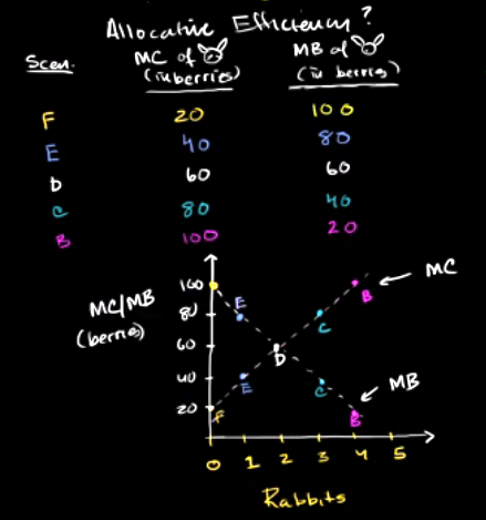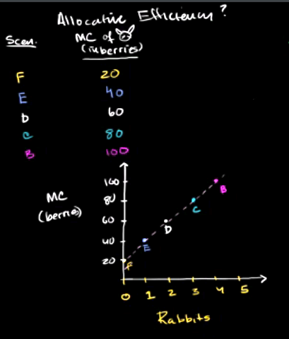 通过上图的函数曲线我们可以看出,D位置时的边际成本和边际效益是相同的。也就是说,在D位置时,多得到一只兔子所付出的成本跟愿意付出的成本是相等的。我们称之为实现了配置效率(Allocative Efficiency)
