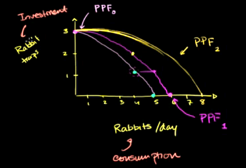 我们将捕捉兔子称为消费(consumption),制作兔子陷阱称为投资(investment)。通过投资,可以增加他的总生效率;如果将他看作一个经济体,那么他正在经历经济增长(economic growth)