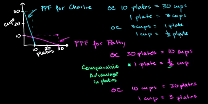 可以看出,Charlie的机会成本为10个盘子=30个杯子,Patty的机会成本为30个盘子=10个杯子。Patty相对于Charlie在盘子上比较占优势